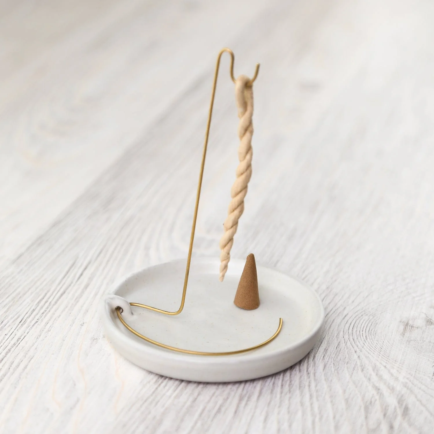 - It features a brass stand that hooks into the base of the burner, allowing you to easily hang and burn your rope incense. The ceramic base makes it great for burning cone incense too!